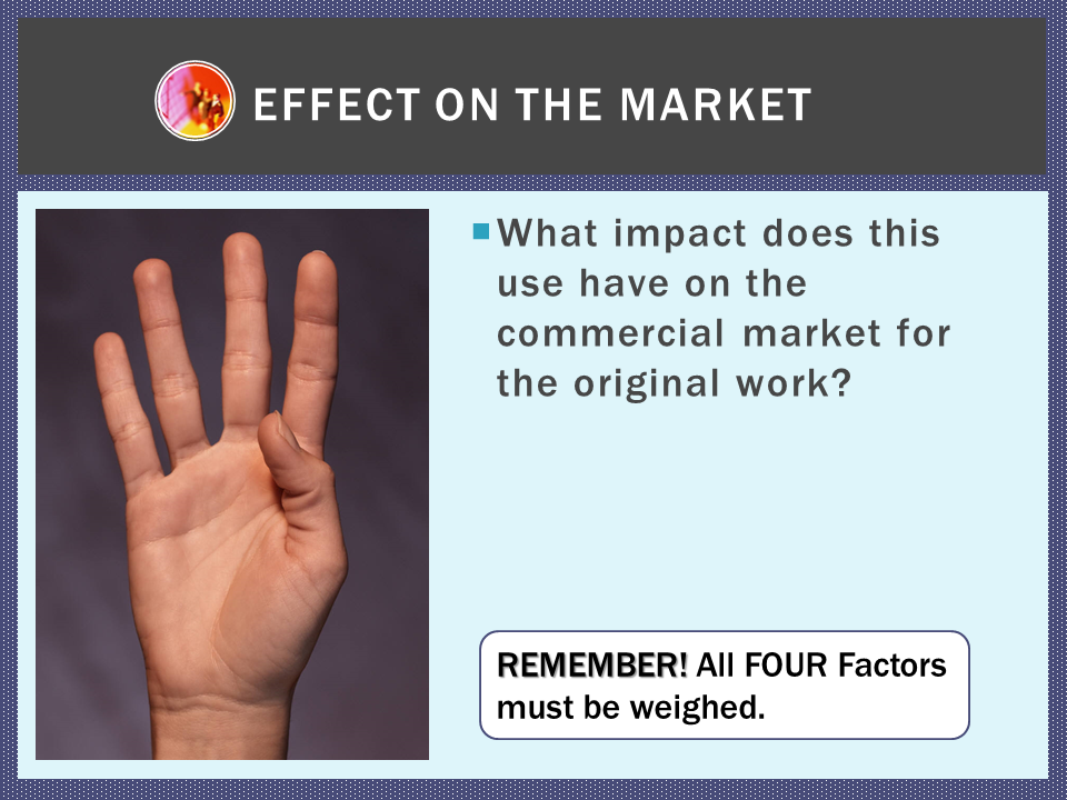 4 Factors to determine Fair Use: Purpose • Nature • Amount • Effect